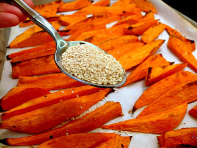 Khi khoai lang chín và vừa bỏ ra khỏi lò bạn rắc ngay 2 thìa vừng rang lên trên.