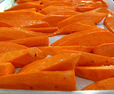 Xếp khoai lên khay nướng, chỉ xếp 1 lớp không để các miếng khoai chồng lên nhau